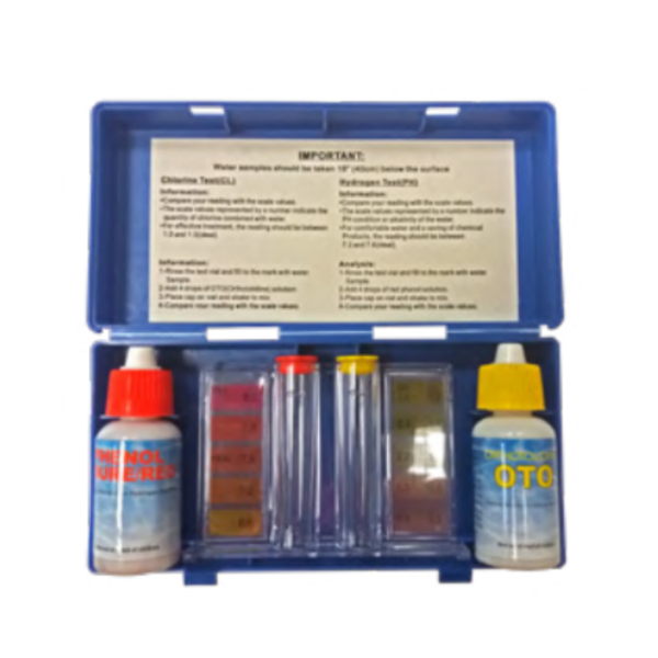 O estojo é composto por 2 reagentes: O amarelo (ortotolidina) para a definição do nível de desinfetante, e o vermelho (phenol) para definição do nível de pH.